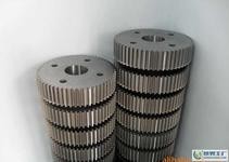 齿面硬度HRC62-65。同步齿轮,由齿圈和齿轮毂组合而成,在叶轮间隙调妥后,用圆锥销定位,齿轮毂与轴采用1:30圆锥配合,便于拆装维修。三叶罗茨鼓风机同步齿轮采用合金钢20CrMoTi,齿面渗碳淬火。高频淬火处理后再经磨齿制成,达到五级精度。齿轮的间隙、精度与运动准确性对于叶轮啮合的均匀与平稳起着决定性的作用,设备摩擦噪声的主要来源之一就是齿轮面的粗糙程度。鉴于罗茨风机的同步齿轮即作传动又起叶轮定位的双重作用,其精度和耐磨度和磨损状态直接影响叶轮的啮合,故而对同步齿轮的精度和耐磨性皆有较高的要求